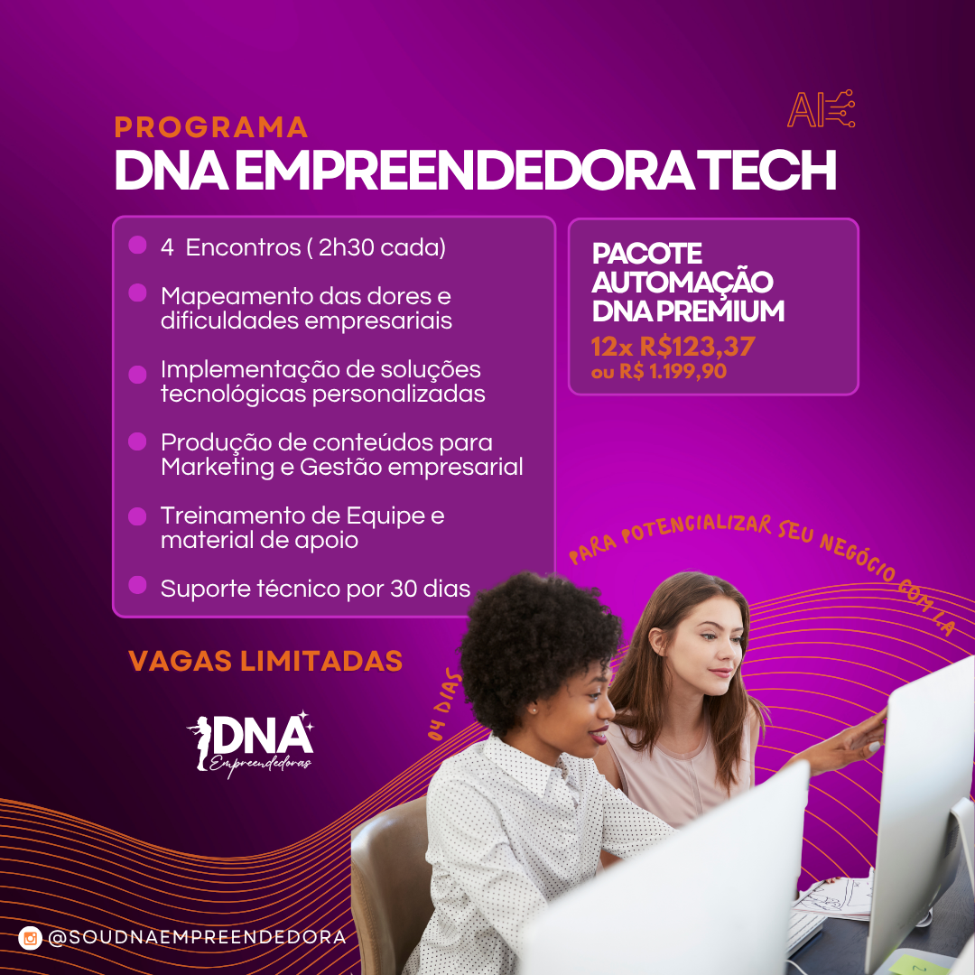 O DNA Tech é um programa completo de aceleração voltado exclusivamente para mulheres empreendedoras que desejam transformar suas empresas através da automação, tecnologia e inteligência artificial.