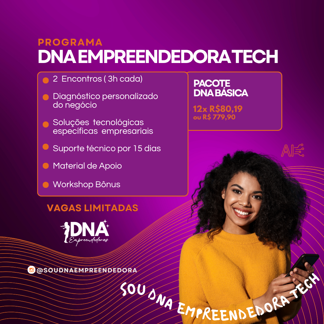 Criado para impulsionar negócios femininos rumo à inovação, o DNA Tech oferece uma solução prática e abrangente para modernizar processos, aumentar a produtividade, reduzir custos operacionais e expandir a capacidade de gestão com eficiência e autonomia.